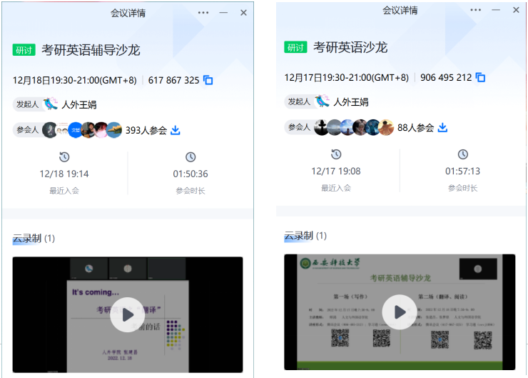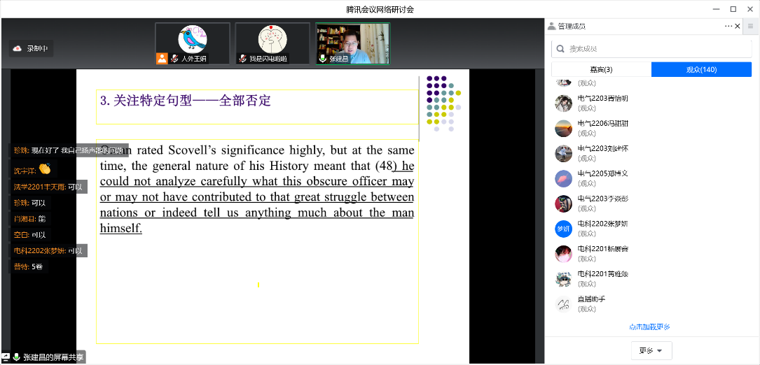 2022年12月17日晚师涛老师从写作的阅卷规则和学生作文实例出发为同学们讲解了写作提高的方法;12月18日晚张建昌老师以历年真题为例,从译文的独立可读性、全部否定句、定语从句等方面讲解了考研英语试卷中涉及的翻译策略;张梦原老师分析了近三年考研真题阅读篇章的难易程度,从中为学生梳理出难句分析、近义替换、态度判断等技巧方法。