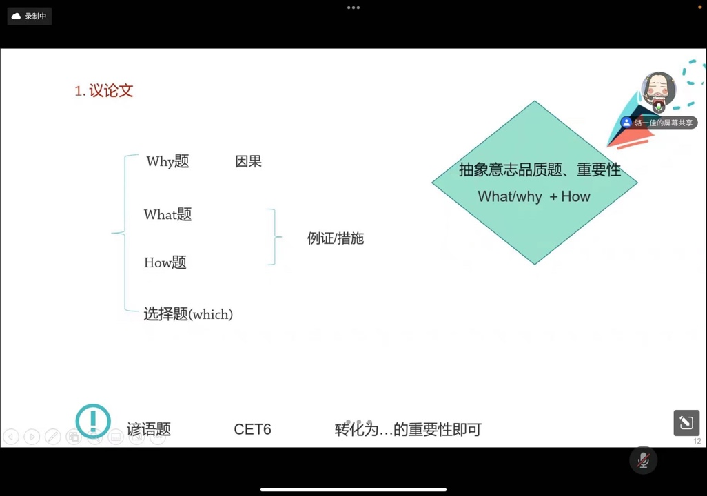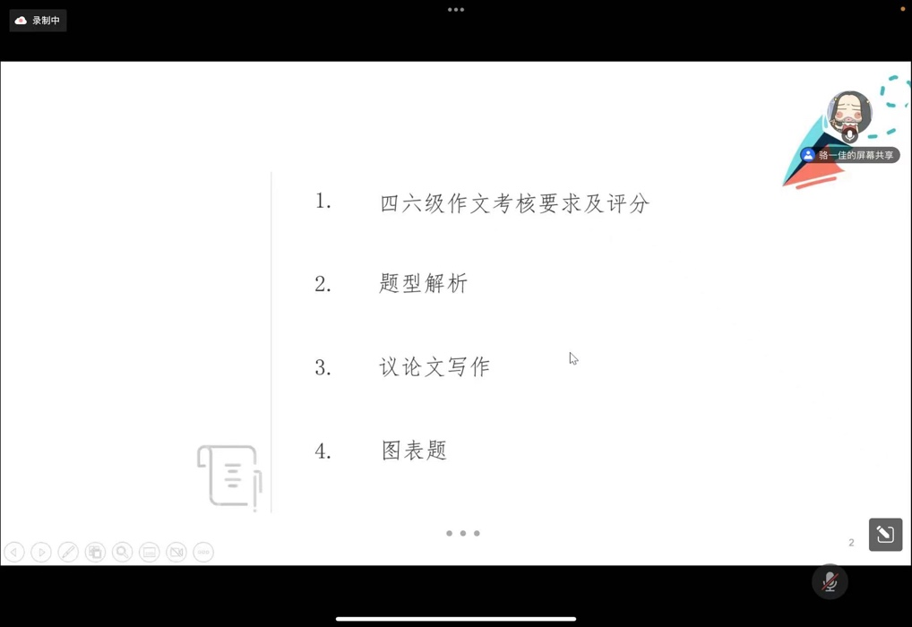 2022年12月4日晚,人外学院举办大学英语四六级辅导沙龙二(翻译写作篇)。本期沙龙由王娟老师主持。沙龙开始,于劼老师与学生一起分享四六级翻译的解题思路;然后,骆一佳老师对四六级写作题型进行细致分析,并通过议论文例文写作为逐步为同学进行详解;最后两位老师为同学们进行现场答疑。