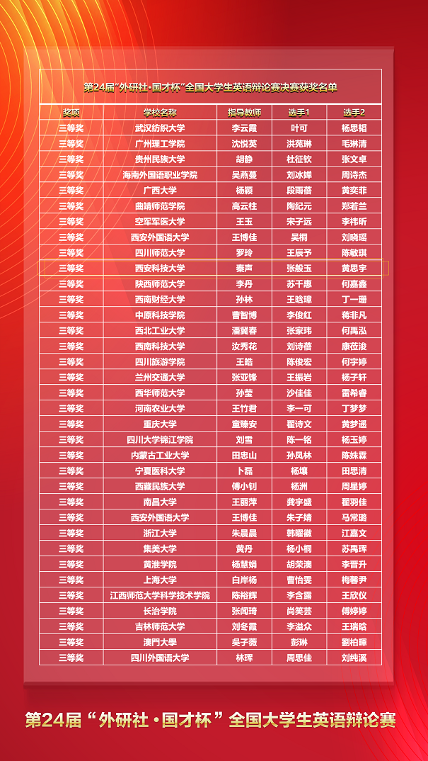 第24届“外研社•国才杯”全国大学生英语辩论赛全国总决赛于6月10日至13日在腾讯会议线上进行,来自全国东、西、南、北四大赛区的130余支队伍云端逐鹿。由正规滚球app平台官网张般玉(英语2101班)、黄思宇(法学2002班)在指导老师秦声的带领下代表我校参赛,历经三天共计八轮激烈角逐,最终获得全国总决赛三等奖。