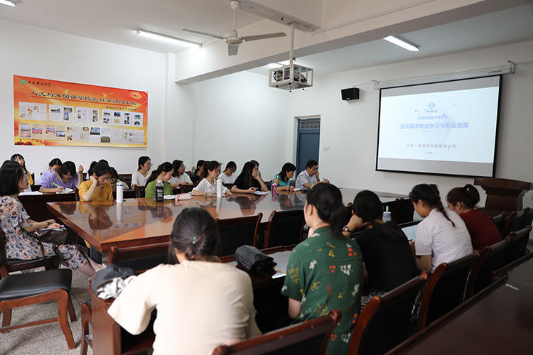 7月12日下午,夏令营邀请到译喵网络科技有限公司技术总监刘刚、上海一者信息科技有限公司陕西、河北大区总监刘林岩做两场学术讲座。讲座由学院MTI中心主任张建昌主持,学院研究生英语教研室主任高宝萍出席活动。刘刚以“人工智能时代下翻译专业与企业人才需要”为题,从平台的翻译服务模式、行业要求与规范等方面做了阐述,使同学们对MTI的就业前景和市场需求有了认识。刘林岩通过大量数据对语言服务行业的发展以及未来做了说明,为营员未来的规划做参考。同时,她结合产品说明了同学们对于使用计算机辅助翻译技术对翻译工作的帮助,对语料库等专业概念做了初步的介绍。