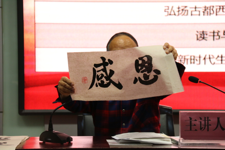报告中,牛迈程通过奋斗、精彩、创新、感恩、爱祖国、爱人民等关键词,从源深流长的悠久校史、励精图治的优秀教师、建树功业的杰出校友等三个方面讲述了西科大的深厚底蕴和感人故事,展示了科大人励志图存、自强不息的精神,并结合自己在书法创作和体育锻炼等方面的感悟,鼓励青年学生要不断完善和提高自己,做一个充满激情、阳光和力量、对未来充满信心的人。