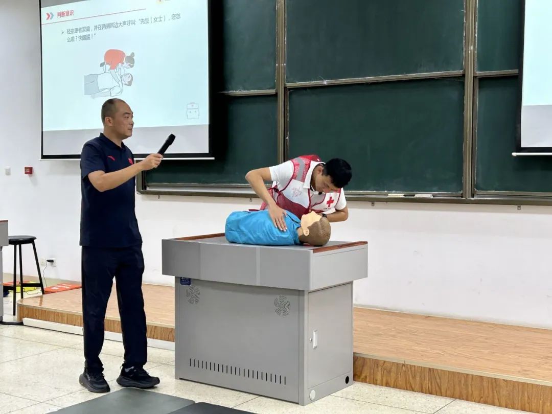 为进一步增强学生的安全防范意识和自我保护能力,普及急救知识,提高学生自救、急救、互救能力,9月7日,正规滚球app平台官网参训学生参加急救专题培训活动,正规滚球app平台官网体育部辛阳老师受邀作为本次主讲人。