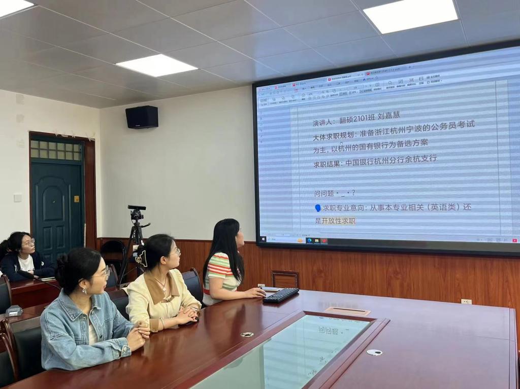 会上,汪学冰从如何申博、申博前所做的准备两方面分享了个人升学经验。赵慧分享了个人持之以恒考教师编的心路历程。刘嘉慧结合翻译专业特色,对从事不同行业进行了分析,希望大家对合理规划自己职业生涯。