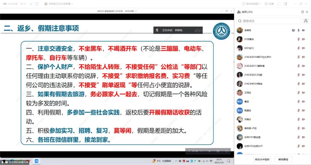 会上,辅导员领学了学校《关于做好2025年寒假研究生教育管理相关工作的通知》〔研工函(2025)1号〕和《关于做好2025年元旦假期和寒假学生安全教育管理服务工作的通知》〔学工函(2024)57号〕文件内容,传达了学校相关工作会议精神,重点围绕消防安全、交通安全、食品安全、网络安全、实习求职安全、防范电信诈骗等多个方面进行了强调,要求全体学生要提高安全意识,做好离校前宿舍及工作室安全、寒假假期去向登记等工作,不断提高识别风险、规避风险、自救自护的能力。