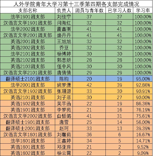 在本次青年大学习中,法学1901团支部、汉语言文学1901团支部、法学2001团支部、法学2002团支部、汉语言文学2002团支部、英语2001团支部、英语2002团支部、翻译硕士2101团支部、法学2101团支部、英语2101团支部、英语2103团支部、汉语言文学2101团支部完成率达到100%,3个团支部完成率在95%以上,2个团支部完成率在80%以上,但仍有6个团支部完成率在80%以下,在此希望完成率高的团支部能再接再厉,而完成率欠佳的团支部,希望团支书能够积极督促本支部同学进行学习,从“青年大学习”中学到知识,了解政策,在新时代争做新青年。