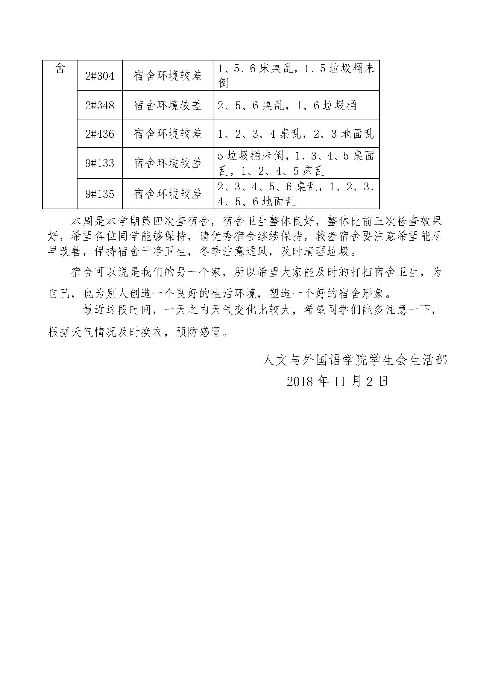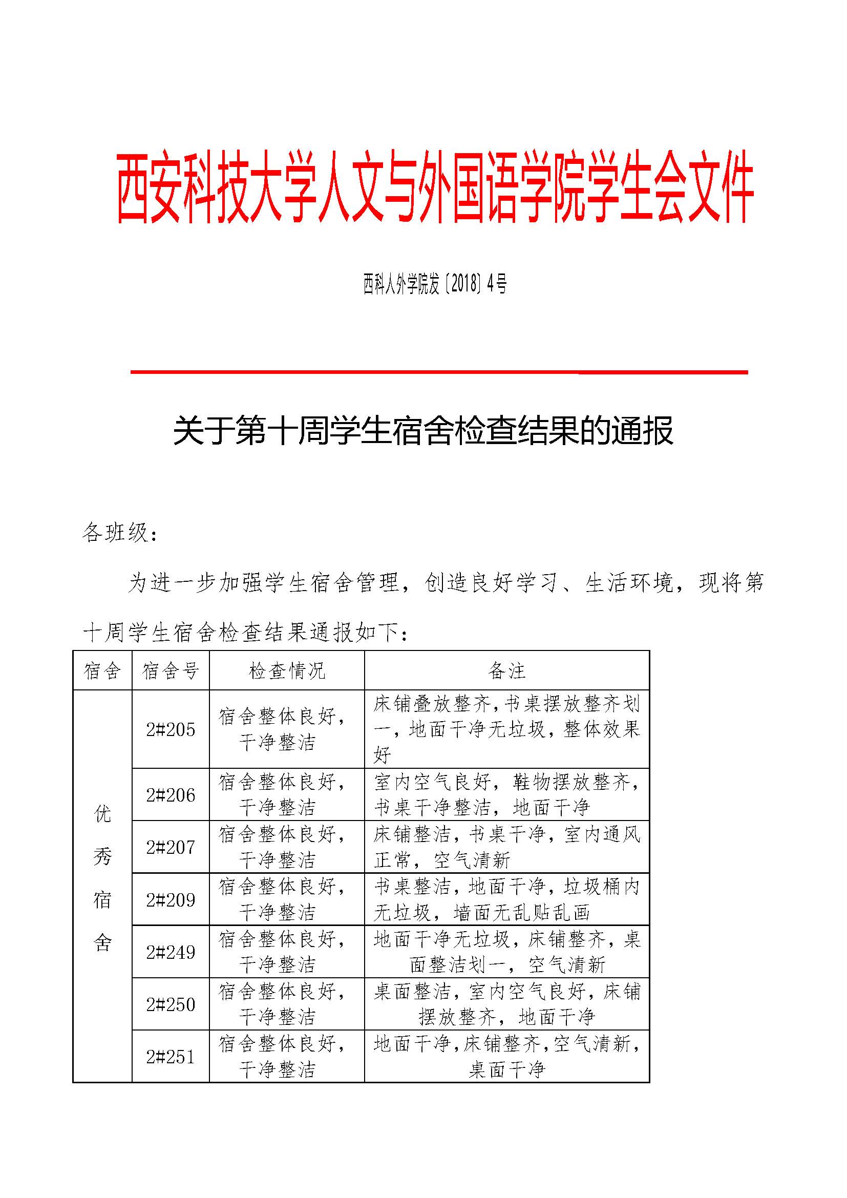 关于第十周学生宿舍检查结果的通报