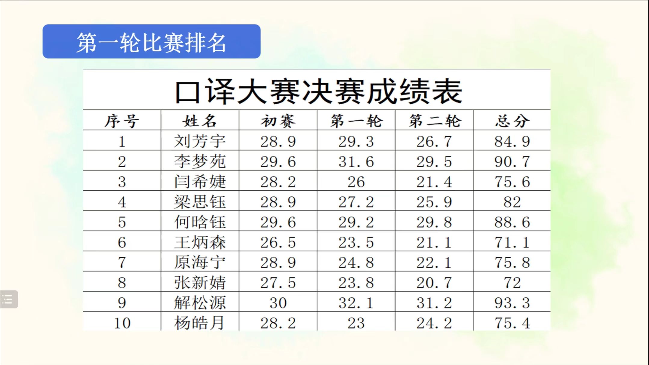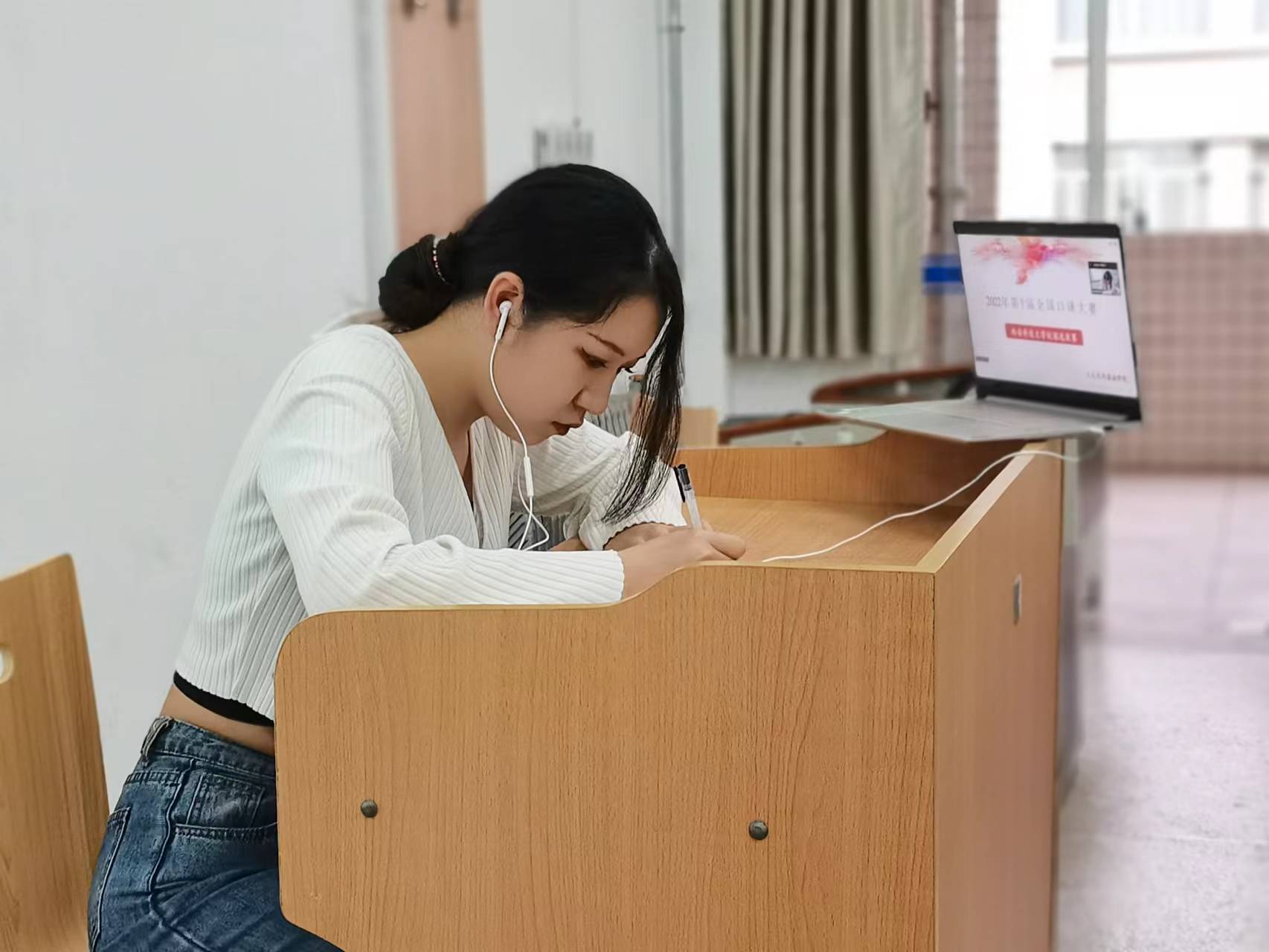 本次比赛共有来自人外学院、电控学院、测绘学院、机械学院等不同专业、不同年级共36名同学报名,经过初赛选拔,最终有10名选手晋级决赛。决赛由英译汉(第一轮)和汉译英(第二轮)两个环节组成。在第一轮比赛中,参赛选手将听到一段时长为1分38秒、主题为“中非合作发展”的英语音频。选手们需在录音播放结束后立即进行交替传译,评委们则依据选手的翻译质量和综合表现进行打分。本环节音频中具有较多外交类专业词汇,对选手的英语听辨能力、口译笔记技巧及语言整合能力具有较高的要求。第二轮比赛为汉译英,选手将根据一段时长为1分钟、主题为“中国的新冠疫苗注射情况”的汉语音频,进行汉译英交替传译。本轮比赛的材料中含有较多数字,对选手的汉英数字转换能力、思维能力和语言组织能力具有较高的要求。