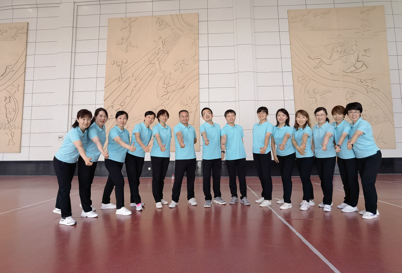 健康有我”教职工广播操和健身操比赛。来自17个分工会300余名教职工参加了比赛。我院党委书记费秀水、分工会主席邹虹、张燕清、高宝萍等14名教师参加了第九套广播操和健身操的比赛。