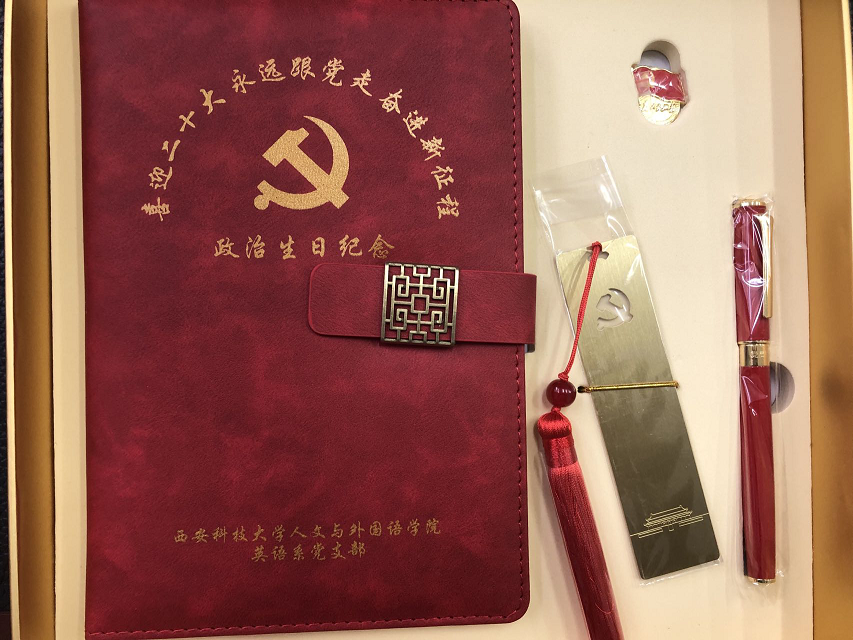 英语系支部统一印制了党员“政治生日”礼物,包括“一份纪念册,一枚党徽、一页书签、一支钢笔、一个笔记本”。在集体唱完国歌后,支委委员杜戍涓和史凤玉把礼物送到每位党员手中。支部书记时健带领大家面对党旗,庄严地重温了入党誓词。