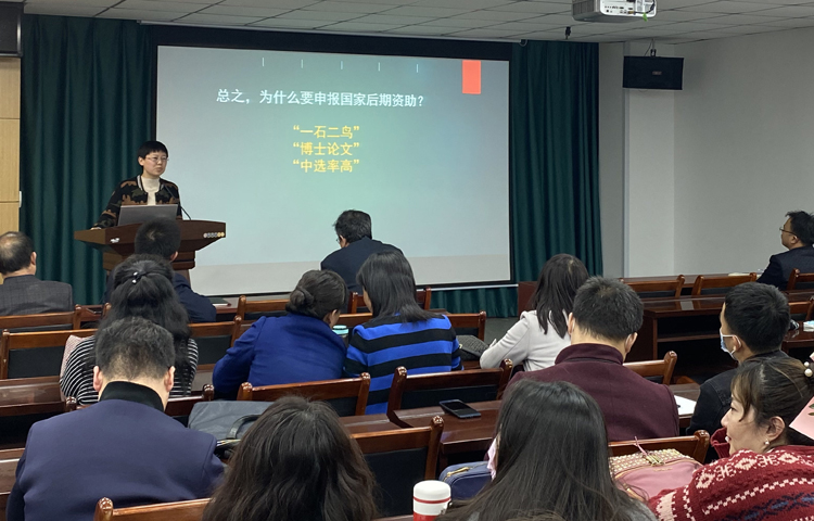杨洪敏副教授则以国家社科基金后期资助项目申报为侧重点,介绍了该项目的学术地位、基本概况、发展概况,并详细介绍了该项目的申报要求,分析了申报项目中应该注意的地方,也提醒不得申报的情况,鼓励大家积极申报。