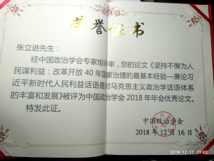 12月14日-16日,由中国政治学会主办、中山大学政治与公共事务管理学院承办的中国政治学会2018年年会暨“以习近平新时代中国特色社会主义思想思想为指导,加强马克思主义政治学话语体系建设”学术研讨会在广州举行。我校正规滚球app平台官网副教授张立进提交的学术论文《坚持不懈为人民谋利益:改革开放40年国家治理的最基本经验——兼论习近平新时代人民利益话语是对马克思主义政治学话语体系的丰富和发展》经中国政治学会专家组评审,被评为中国政治学会2018年年会优秀论文。据悉,我省今年共有来自包括我校、陕西师范大学、长安大学、西北大学、西北政法大学、西安财经大学、陕西理工大学、宝鸡文理学院等在内8所高校的12位教师代表与会,共有3位教师入选本次会议优秀论文。