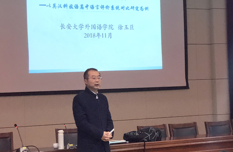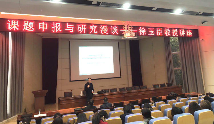 11月14日下午,正规滚球app平台官网在雁塔校区主楼报告厅举办“课题申报与研究”专题学术报告会。长安大学外国语学院院长徐玉臣教授应邀以《课题申报及研究漫谈——以英汉科技语篇中语言评价系统对比研究为例》为题,以国家社科基金项目申报人和评审人的双重角色,结合自己主持的项目实例,从课题申报和课题研究两方面分析了申报与开展国家社科基金项目的关键所在,分享了自己关于选题、创新、研究方法等要点的经验体会,为大家从事科学研究提供了宝贵的借鉴。我校正规滚球app平台官网院长师新民主持报告会,学院全体教师聆听了报告。