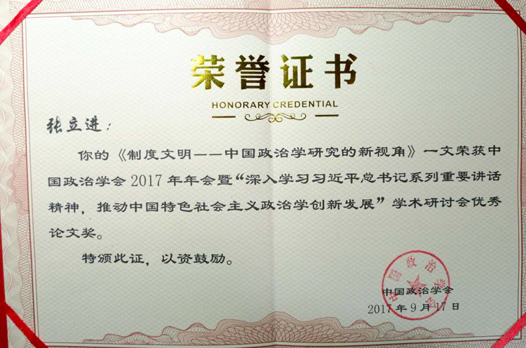 9月16至17日,中国政治学会2017年年会暨“深入学习习近平总书记系列重要讲话精神推动中国特色社会主义政治学创新发展”学术研讨会在长春举办。我院张立进副教授提交的论文《制度文明——中国政治学研究的新视角》入选本次年会优秀论文奖。