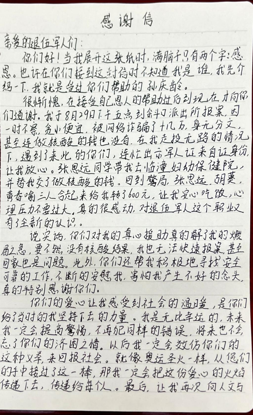 张思远同学分享了自己“见义勇为”的过程和感受,并表示“出手相助是本能反应,能够如此有条理的解决问题也多亏了在部队的训练,我们始终坚持退伍不褪色,不忘初心为人民服务”。