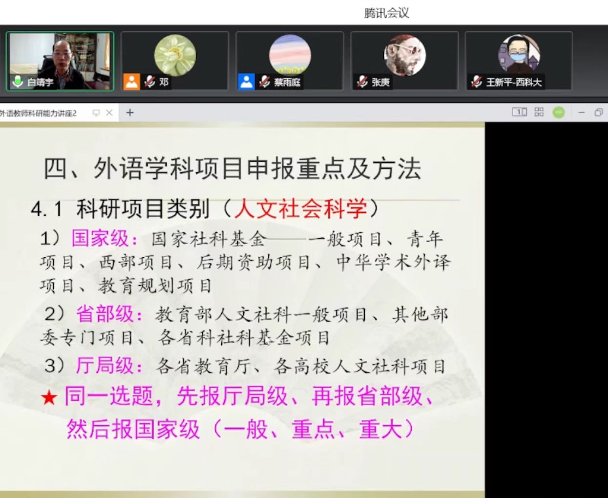 在本次讲座中,白靖宇教授结合自身丰富的工作实践经验,针对外语专业定位与选题学科分类、外语科研困境与项目前期研究、外语教师科研能力提升路径、外语学科项目申报重点及方法四点进行了细致全面的讲解。在外语专业定位与选题学科分类方面,白靖宇教授详细地介绍了外语学科的分类与主流方向,并举出诸多贴合专业的例子,为老师们明确了申请书的填写注意事项。在外语科研困境与项目前期研究方面,白靖宇教授以几篇论文为例解析了如今科研项目申报中的问题,并给出了问题突破的关键点。在外语教师科研能力提升路径方面,白靖宇教授用一系列生动的实例提出教师提高科研能力的建议。在外语学科项目申报重点及方法方面,白靖宇教授指出了科研项目的选题要点及注意事项,也为教师们的科研项目申报准备提出了一些切实的建议。