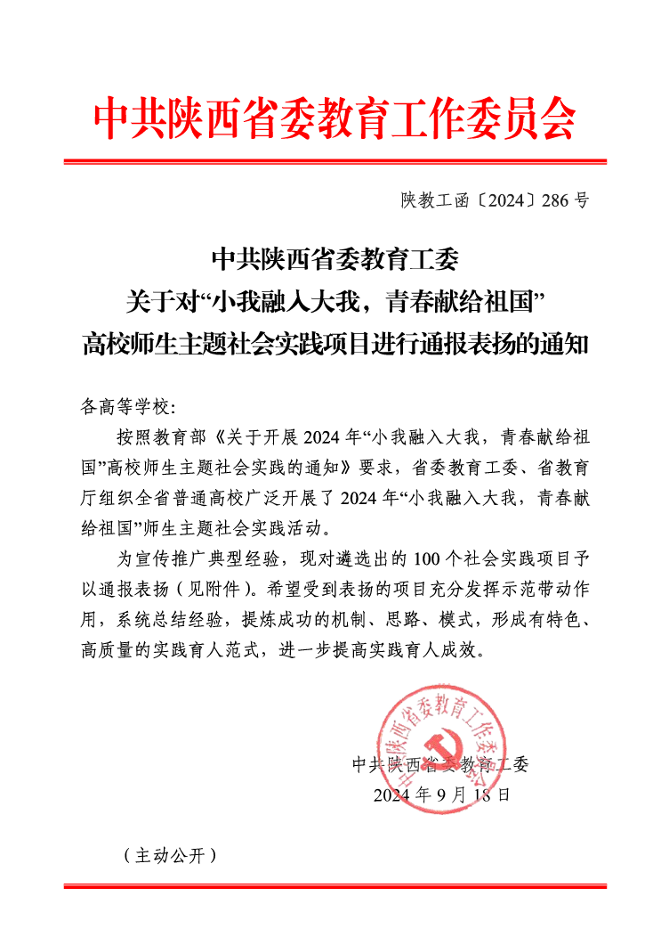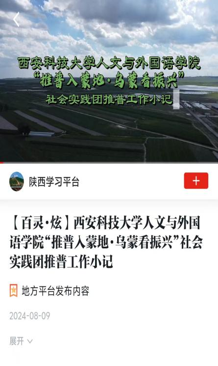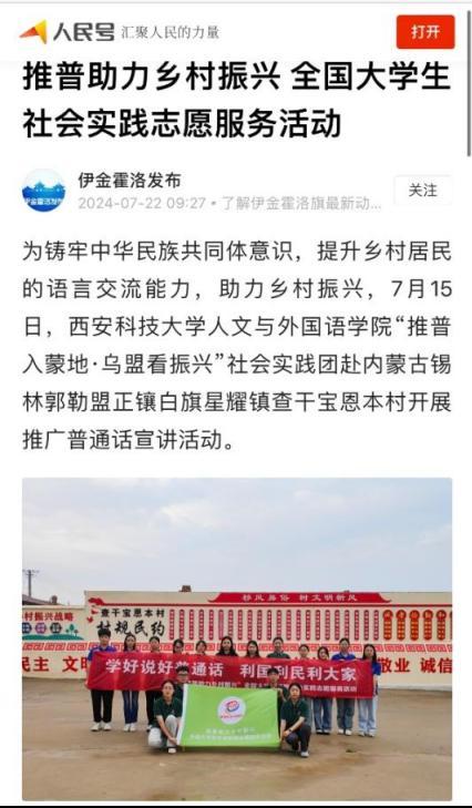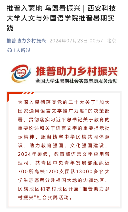 近日,陕西省委教育工委、省教育厅面向全省普通高校组织开展2024年“小我融入大我,青春献给祖国”高校师生主题社会实践活动,最终遴选出100个优秀案例。我院申报的《深入边疆少数民族地区推广普通话,助力基层语言文化交流传播》获优秀案例。