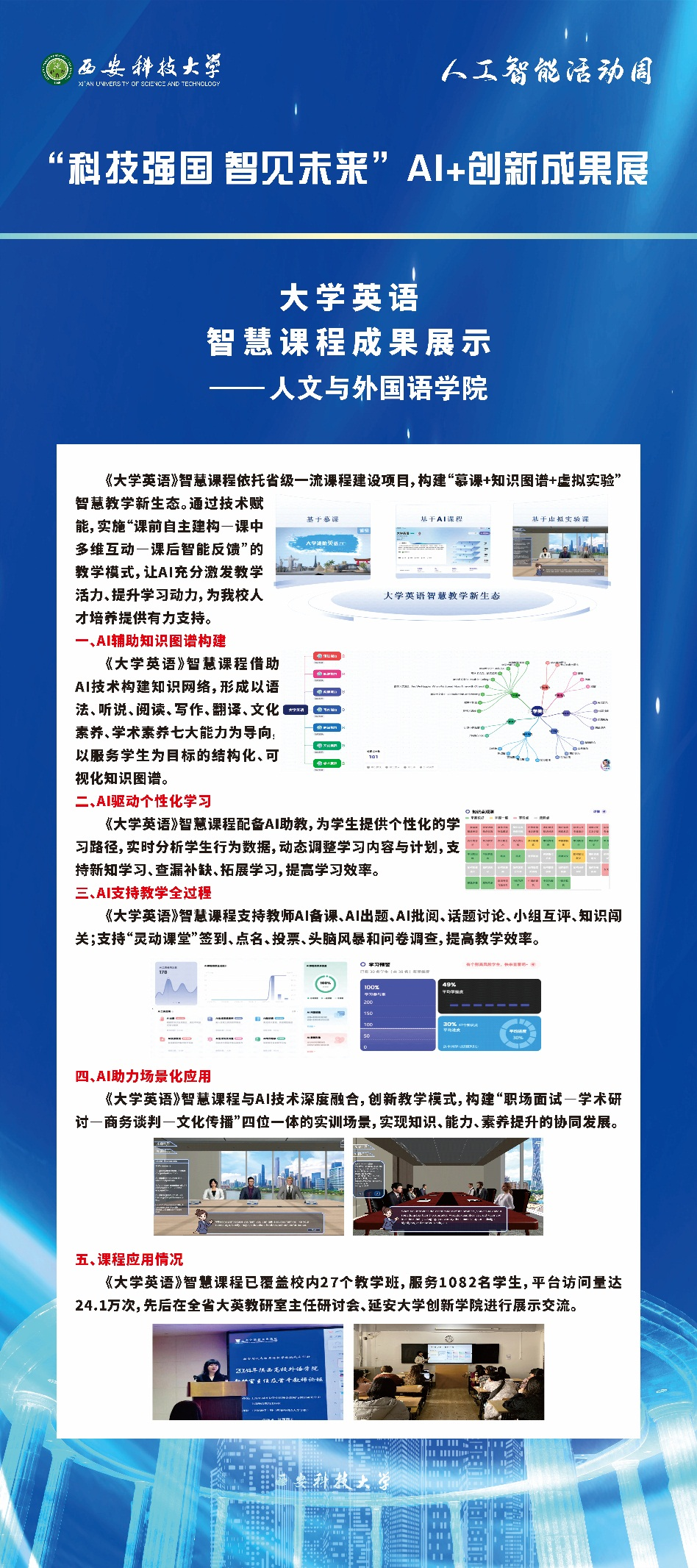 为深入贯彻落实习近平总书记关于加快人工智能发展的重要指示批示和全国教育大会精神,深化AI赋能高质量教育教学改革,推动人工智能发展与学科专业交叉融合,展现我校AI+教育教学创新成果,我校“科技强国·智见未来”人工智能活动周系列活动自5月1日启动,正规滚球app平台官网遴选《大学英语》智慧课程参加本次活动周展出。