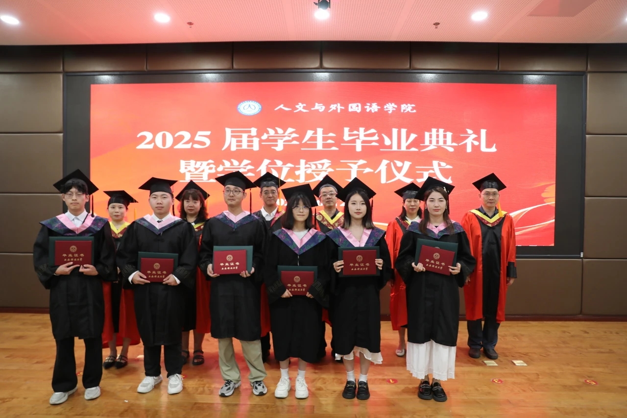在随后的学位授予仪式上,全体毕业生依次登台。学院领导、学术委员会委员代表为毕业生一一颁发毕业证和学位证、正冠拨穗并合影留念。