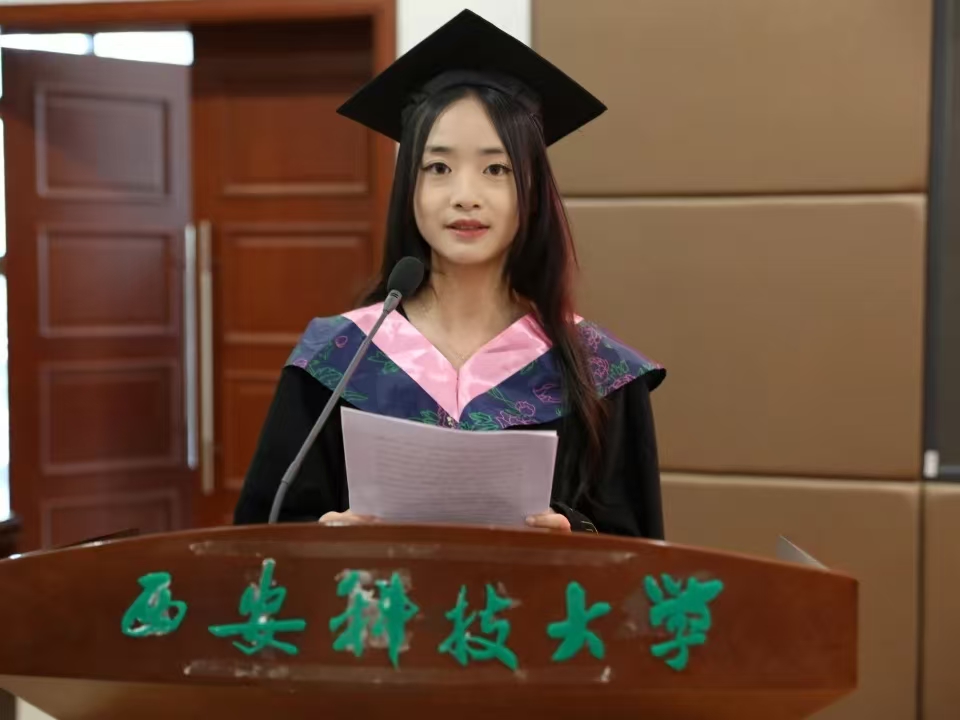 在校生代表安永琪向即将奔赴四方的学长学姐们致以诚挚祝福。她表示,学长学姐们的奋斗历程与卓越成就,是照亮前行道路的明灯。她将携手全体在校生,以学长学姐为榜样,深耕学业、笃行不怠,在求知路上奋勇前行。