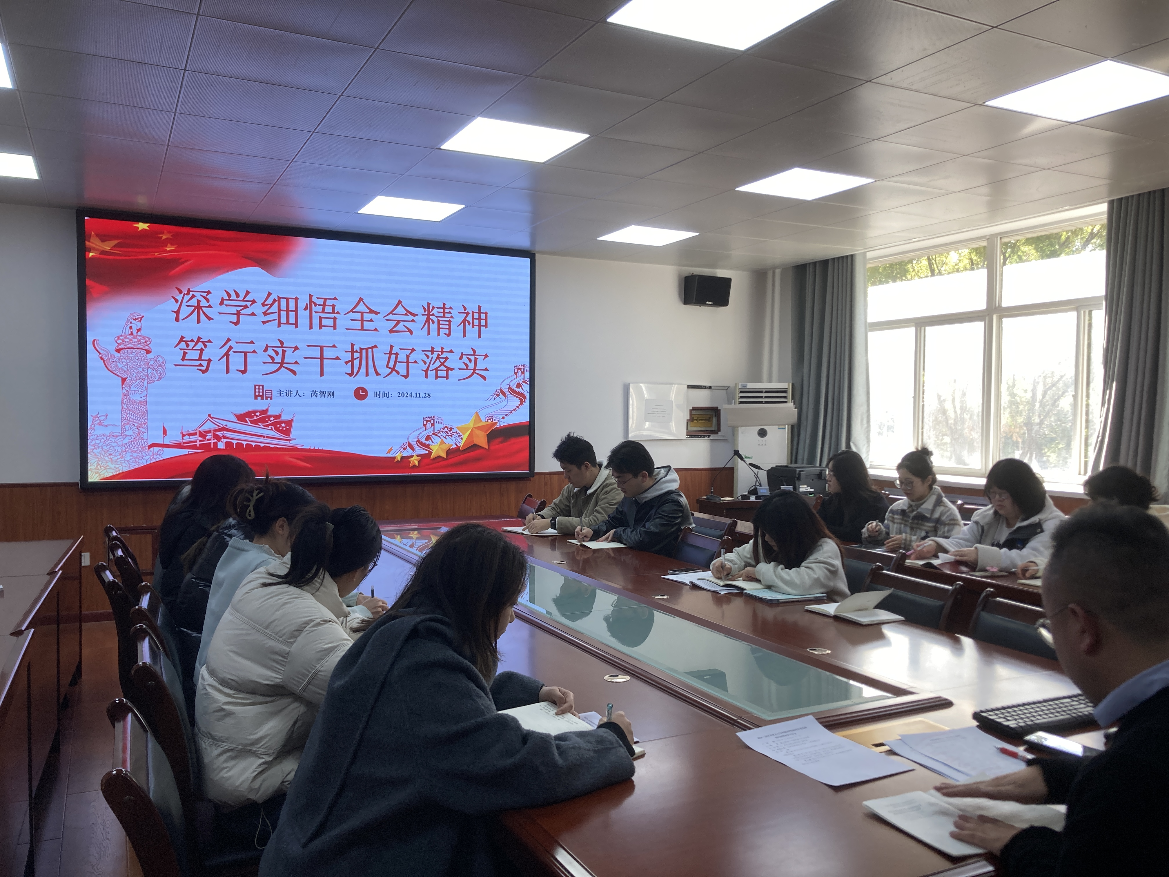 第四次学习(11月28日)党支部书记芮智刚主持了“深学细悟全会精神,笃行实干抓好落实”主题党课。党课围绕党的二十届三中全会的重大意义、核心要义以及如何贯彻落实全会要求进行了深刻讲解,强调党员干部应在学习贯彻全会精神中发挥示范带头作用,推动各项工作高质量发展。