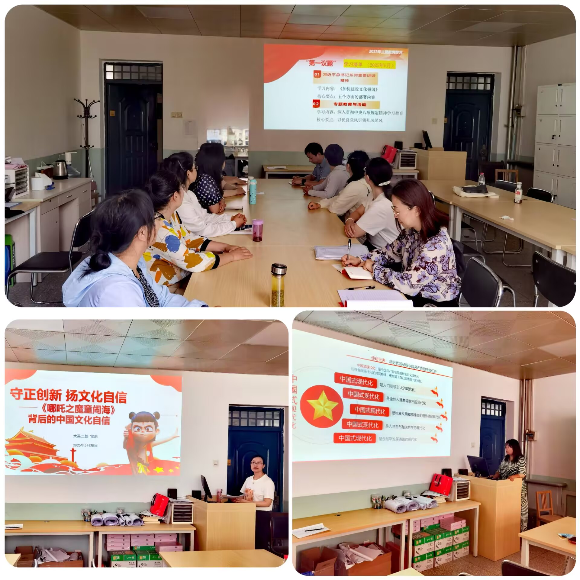 5月28日下午,大学英语教学二部党支部在骊山校园召开“守正创新扬文化自信”主题党日活动,开展深入贯彻中央八项规定精神学习教育集体学习,并观看案例警示教育纪录片。副院长张辉到会指导并讲授党课,党支部书记王芳主持会议。