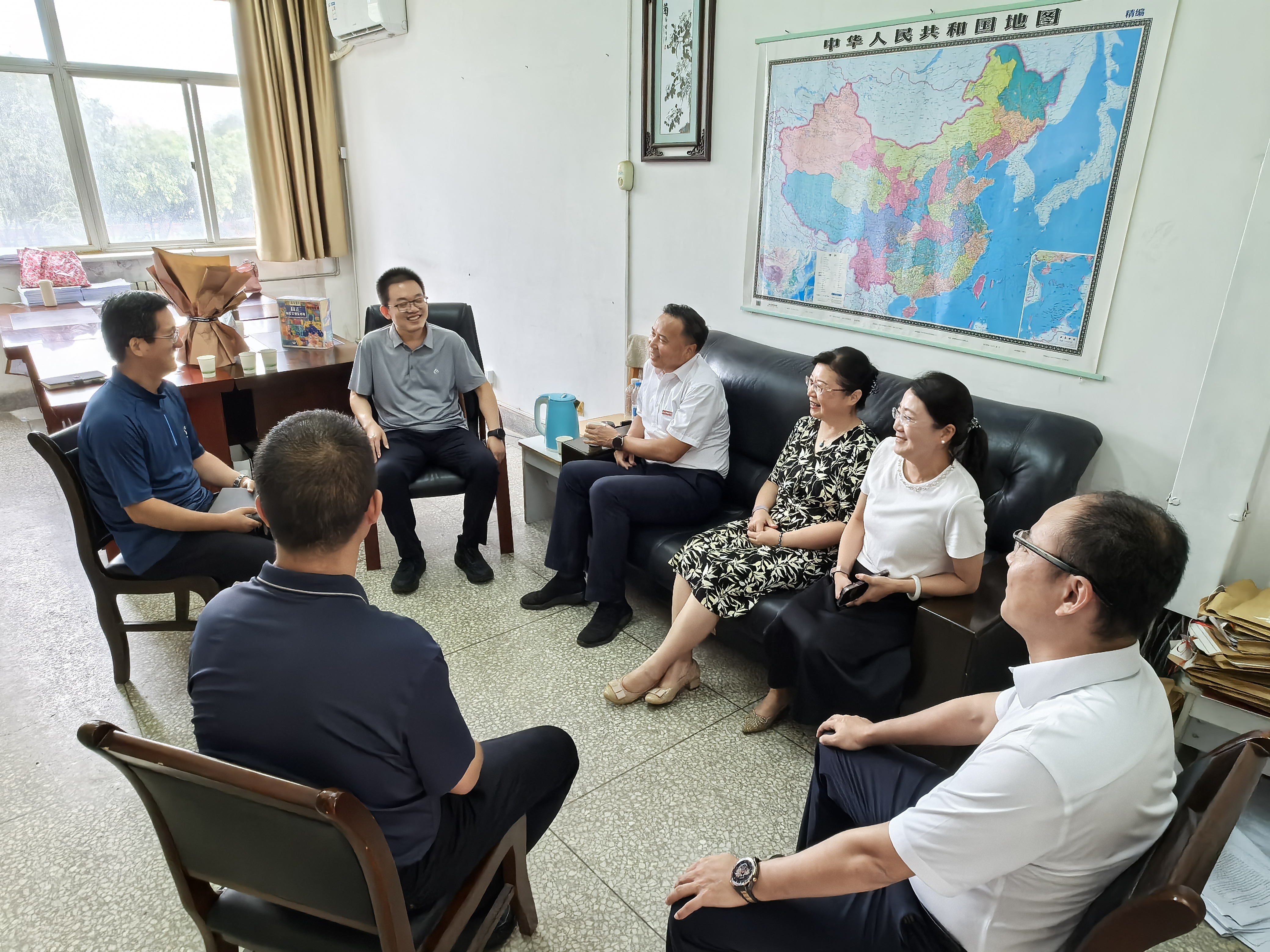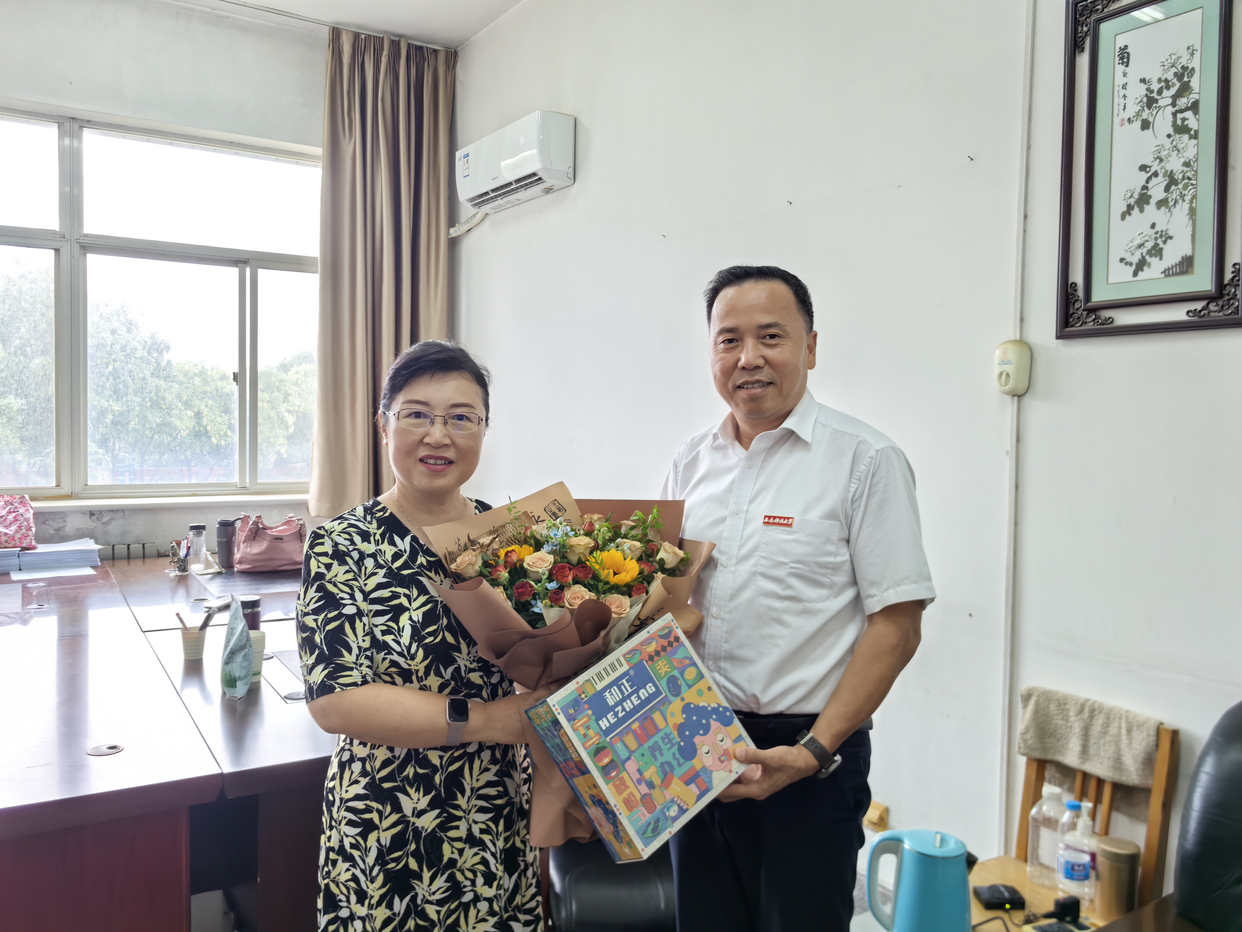 陈春林一行来到教师代表张燕清教授的工作室,送上鲜花和慰问品并表达了节日的祝福。陈春林和张燕清亲切交谈,询问了生活和工作情况,对她在教育教学、学生培养等方面做出的努力和取得的成绩表达了敬意。陈书记鼓励她继续弘扬教育家精神,坚守立德树人初心,做党和人民满意的“四有”好老师。并通过她向战斗在教育一线的人外学院教师们致以节日祝贺和诚挚问候。陈春林希望人外学院教师努力在以文化人、以文育人等方面充分发挥自身特色优势,培养专业素质过硬、德才兼备的优秀人才,为学校高质量发展作出人外贡献。